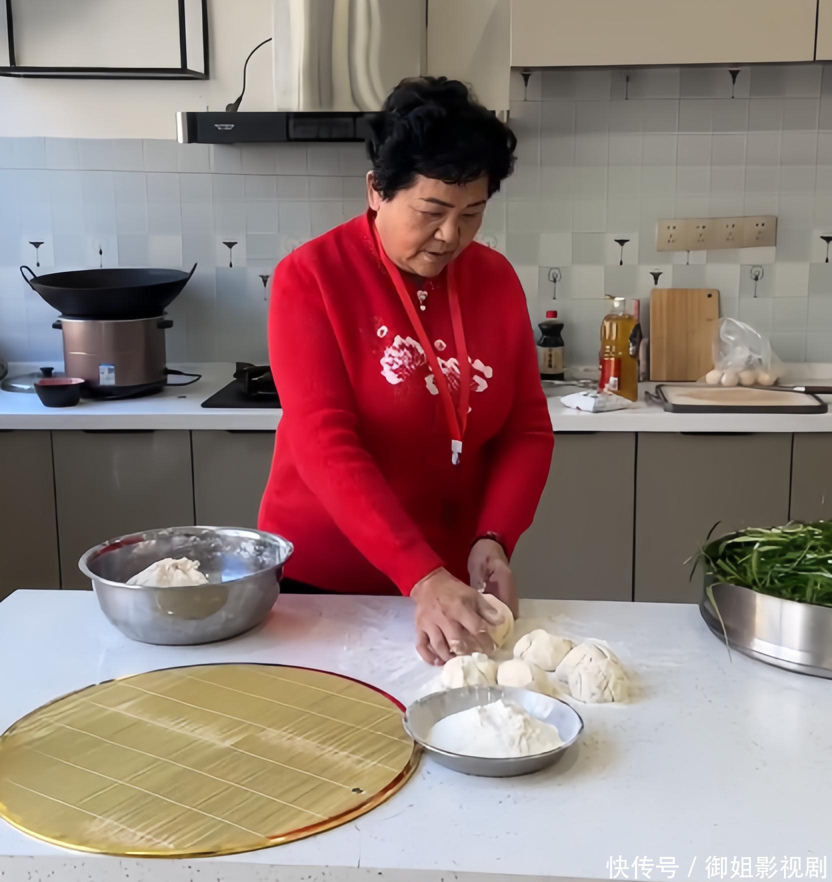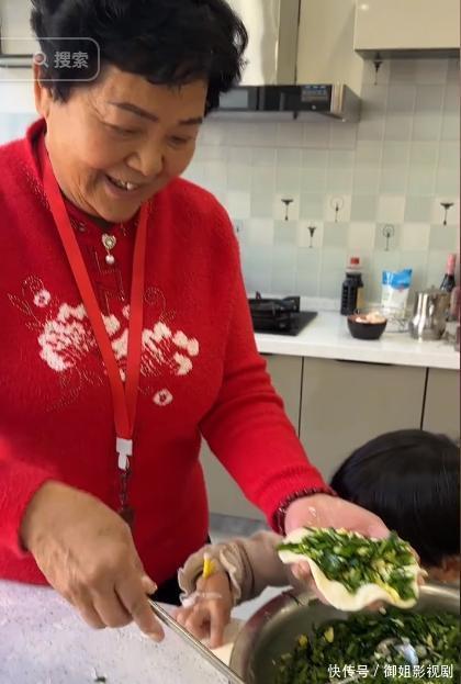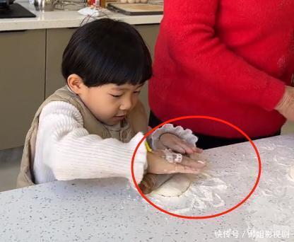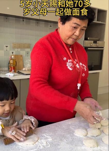 已经70多岁的田新菊身穿喜庆的红毛衣,浑身是劲儿的在案板上揉面,小天赐则是依偎在妈妈的身边,开心的冲着镜头笑着。