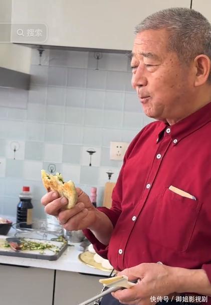 镜头走近一看,原来这老两口是在烙饼,黄伟平正在一旁和肉馅,小天赐的表哥们则是在后面打下手。