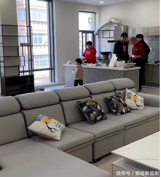 视频一开头,就是小天赐一家人在开阔式厨房里忙活,还真别说,这豪华大沙发、宽阔的落地窗,确实让人羡慕不已。