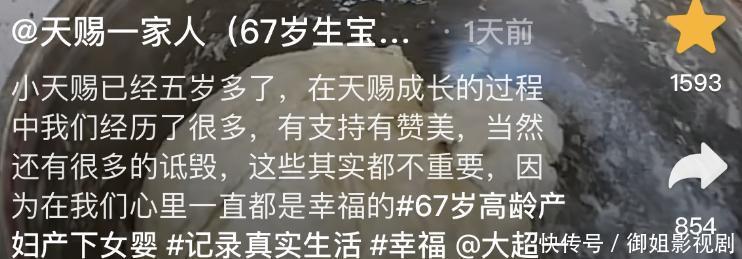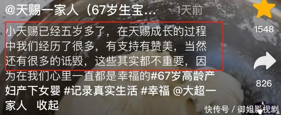 看来搬进新家的老两口有了新感悟,田新菊在67岁才生下天赐,这种匪夷所思的事情在互联网上自然有很多非议之声,但生活毕竟是自己的,只要自己觉得幸福快乐,其他人说的话都是浮云!